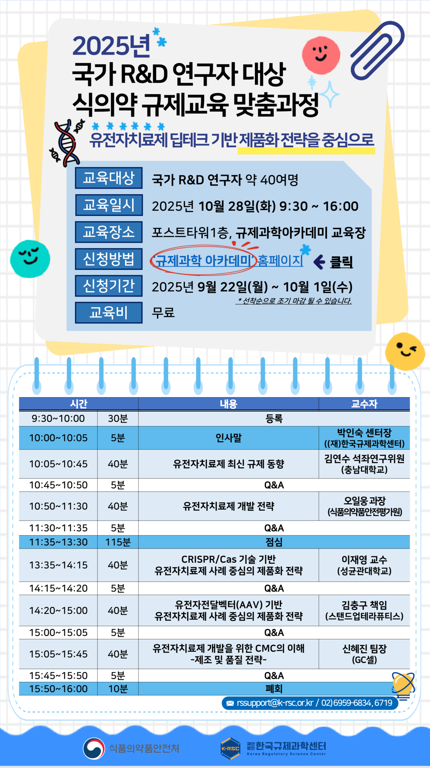 10월 28일(화) 「2025년 국가 R&D 연구자 대상 식의약 규제 교육 맞춤과정」 개최하고자 하오니 관심있는 분들의 많은 참여 바랍니다.
