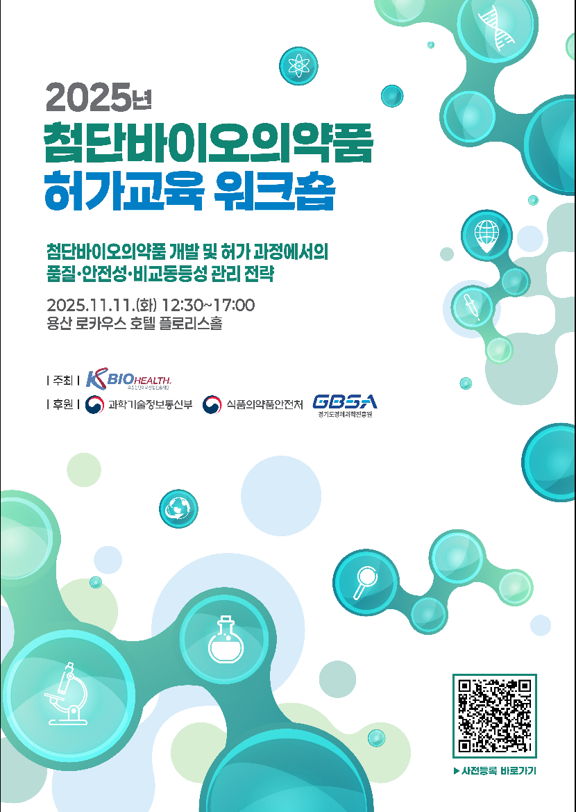 - 문의: 2025년 첨단바이오의약품 허가교육 워크숍 사무국 TEL: 02-430-5741 / E-MAIL: k.miceteam@gmail.com