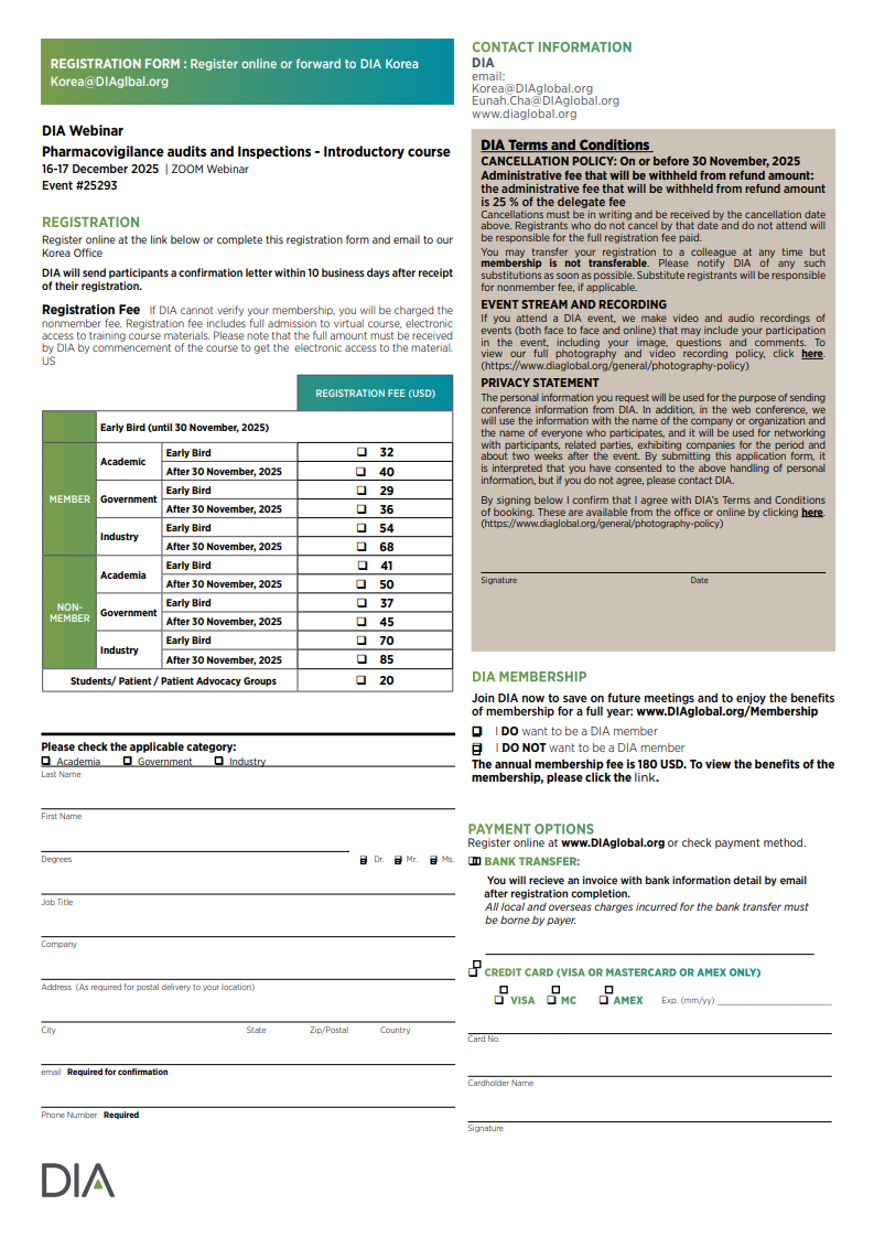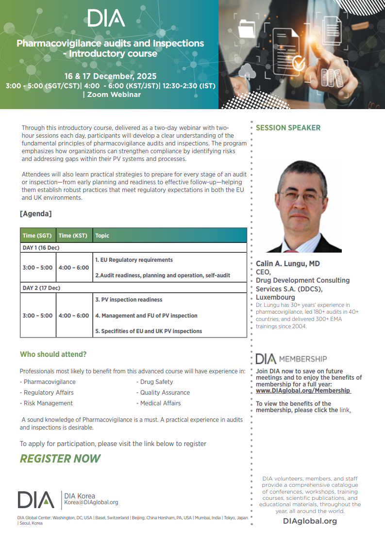 PV Audit and Inspection: 강사는 이 분야에서 30년 이상의 경력을 보유한 최고 전문가로, EMA에서 eudravigilance 트레이너로서 약 300회의 강의를 진행하고 180회 이상의 감사를 수행한 바 있습니다. 이번 교육은 아시아 지역의 바쁜 실무자들을 위해 4시간으로 압축하여 진행됩니다. PV 업무에는 감사와 점검이 필수적인 만큼, 최신 지식을 습득할 수 있는 좋은 기회가 될 것입니다